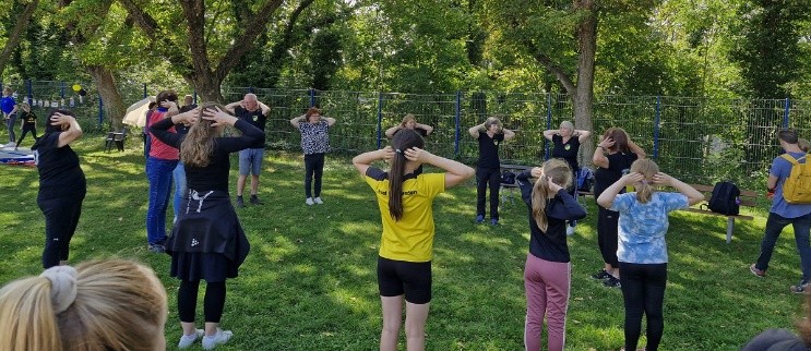Überrascht von dem Ansturm, den wir am Ende durch viele Eltern mit Kindern erlebten, welche ihre Stempelkarten vervollständigen wollten, improvisierten wir noch einmal. Unsere Gymnastikgeräte, die wir u.a. auch in unseren Sportstunden verwenden, wie z. B. Pezzibälle, Hanteln, Gymnastikstäbe, Physiobänder und die kleinen Gymnastikbälle kamen zum Einsatz. Alle Kinder, die noch einen Stempel haben wollten, mussten eine sportliche Leistung erbringen, u.a. mit Kniebeugen, Hanteltraining und /oder Ballspielen. Besonders schön fanden wir, wenn Eltern und Kinder dies gemeinsam taten.