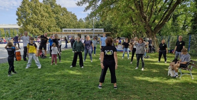 Überrascht von dem Ansturm, den wir am Ende durch viele Eltern mit Kindern erlebten, welche ihre Stempelkarten vervollständigen wollten, improvisierten wir noch einmal. Unsere Gymnastikgeräte, die wir u.a. auch in unseren Sportstunden verwenden, wie z. B. Pezzibälle, Hanteln, Gymnastikstäbe, Physiobänder und die kleinen Gymnastikbälle kamen zum Einsatz. Alle Kinder, die noch einen Stempel haben wollten, mussten eine sportliche Leistung erbringen, u.a. mit Kniebeugen, Hanteltraining und /oder Ballspielen. Besonders schön fanden wir, wenn Eltern und Kinder dies gemeinsam taten.