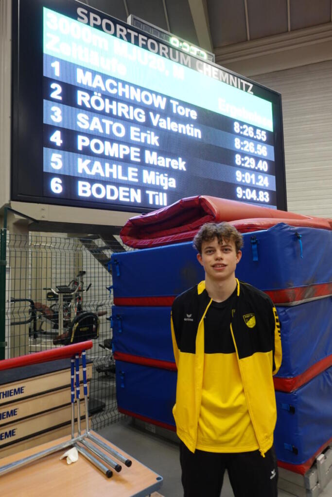 Der Höhepunkt der Hallensaison 2025/26 wartete zum Abschluss im Glaspalast von Sindelfingen. Mitja Kahle hatte Mitte Januar bei den Landesmeisterschaften über 3000m in 9:04,83min die Norm für die Deutschen Hallenmeisterschaften der U20 unterboten. Nach dreieinhalb Jahren waren wir wieder auf der nationalen Bühne präsent. Für uns sind Deutsche Meisterschaften so etwas wie Olympia. Parallel zum Abschluss der Spiele in Mailand / Cortina fand also unser Winterolympia in Sindelfingen statt. Mitja reiste als Vorletzter der Meldeliste an. Nach persönlicher Bestleistung von 9:00,76min belegte er einen starken Platz 22 von 29 Startern. Herzlichen Glückwunsch an Mitja und an Lauftrainer Stephan Merkle.