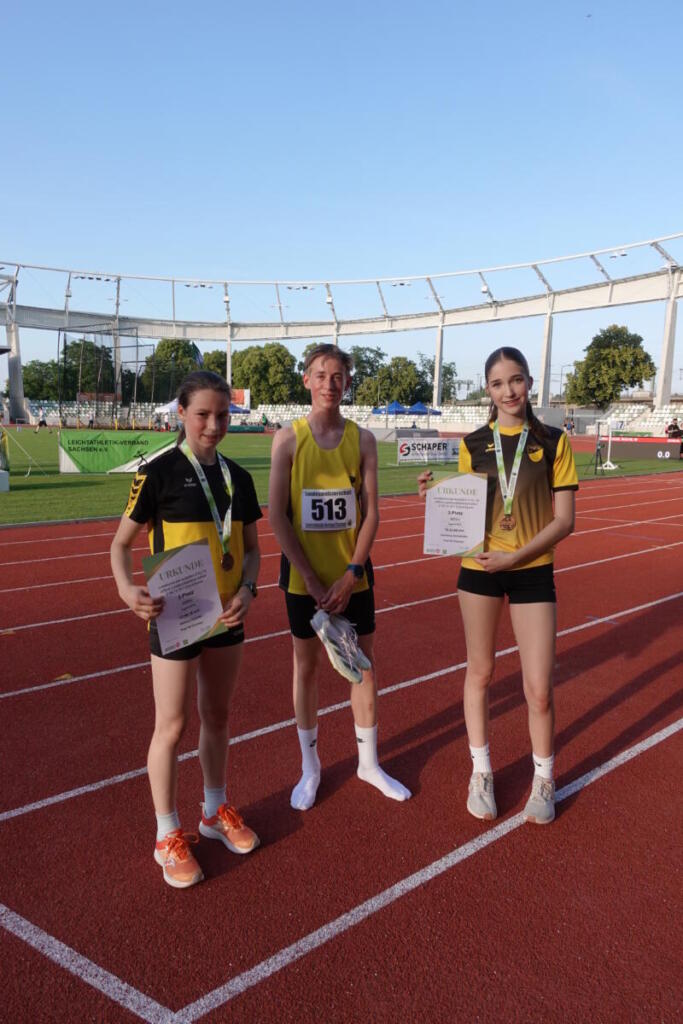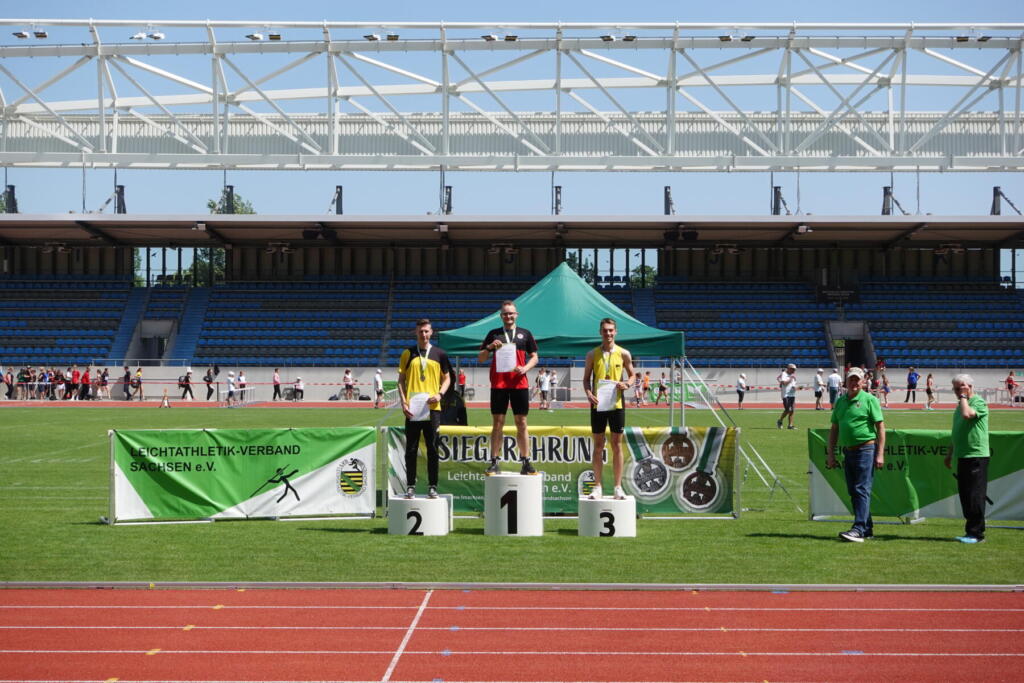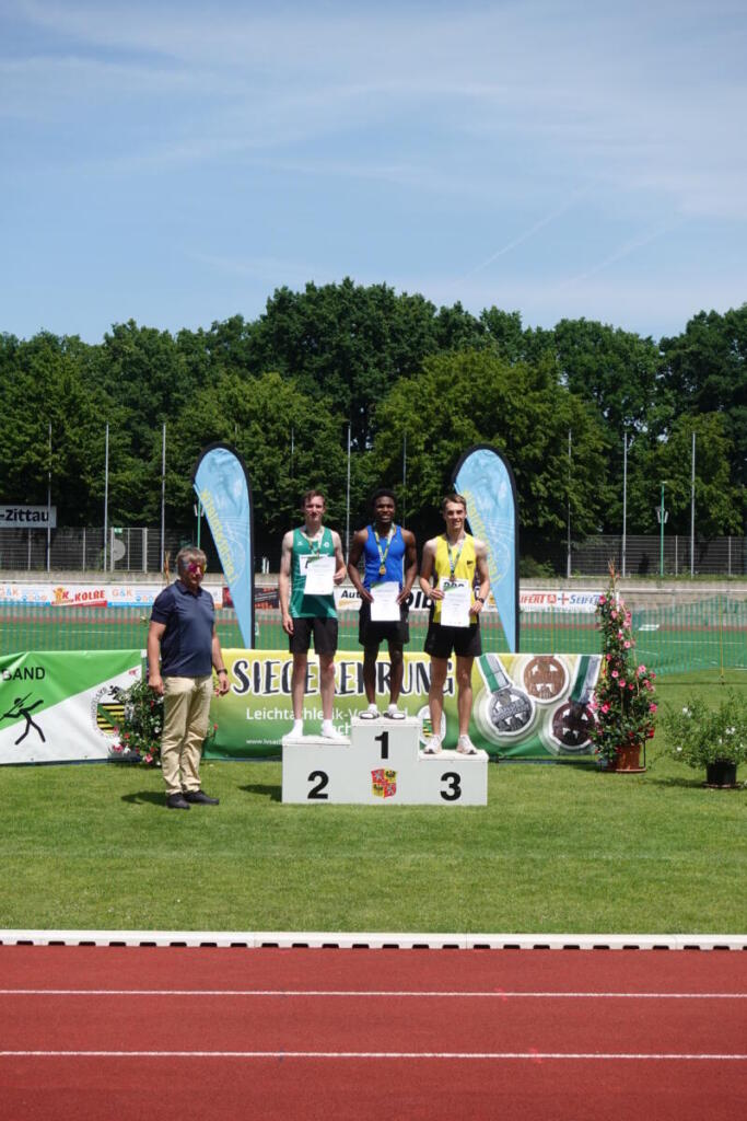 Kaum war der Schweiß getrocknet, ging es ein Wochenende später zu den Mitteldeutschen Meisterschaften nach Zittau. Die Lage am äußersten Rand des Einzugsgebiets sorgte für äußerst schwache Teilnehmerfelder. So musste Job wie letztes Jahr mangels Konkurrenz alleine von vorne weg rennen. Das machte er exzellent, seine 1:53,93min über 800m hätten auch bei einem guten Feld zu einer Medaille gereicht. Dahinter führte Flo die Verfolgergruppe an. In der Form seines Lebens gewann er Silber und legte nach seiner PB von den Landesmeisterschaften nun in 1:58,00 die zweitbeste Freiluftzeit seiner Karriere nach. Mitja ließ auf der letzten Runde über 1500m seinen einzigen Konkurrenten stehen und sicherte sich in neuer Bestleistung von 4;21,19min den Titel. Jannes schlafwandelte auf 400m die erste Rennhälfte über die Bahn, das Podest schien außer Reichweite. Wie immer drehte er auf der zweiten Hälfte und v.a. auf der Zielgeraden auf und kam noch bis auf Platz 3. In 50,71s war er sogar so schnell wie nie unter freiem Himmel. Medaille Nummer 5 sicherte sich Marius. Über 200m führte er in seinem Zeitlauf vom Start weg das Feld an und kam nach 22,25s ins Ziel. Im zweiten Lauf war nur der Sieger schneller, somit Silber für Marius. Teresa absolvierte in Zittau ihren letzten Wettkampf für uns. Verletzungsgeplagt sollte es einfach nur ein schöner Abschluss werden. Mit 8,90m im vorletzten Versuch steigerte sie ihre Saisonbestleistung deutlich und konnte zufrieden die Kugel zur Seite legen.